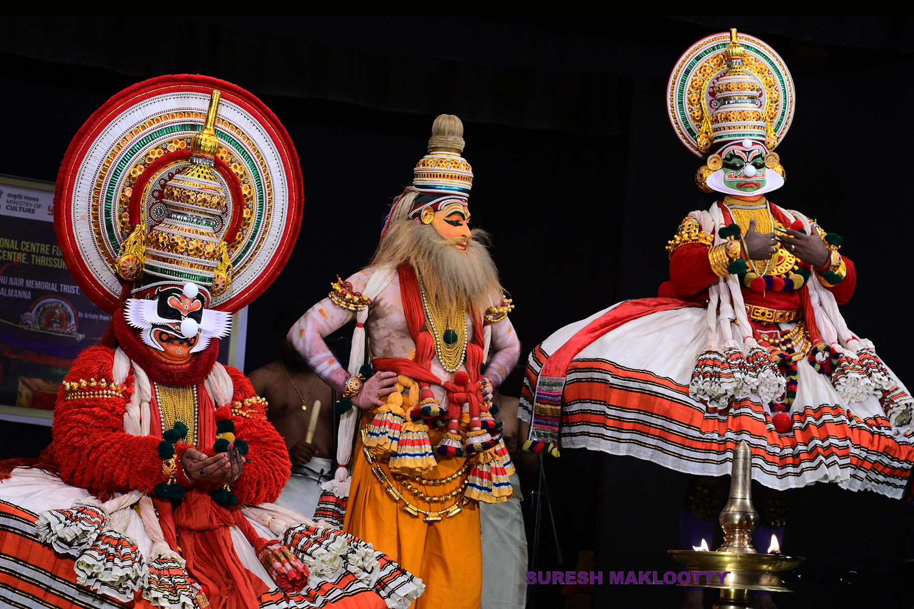 Balivijayam written by Kalloor Namboodiripad (1749-1824), is based on an episode from the Ramayana. Sage Narada visits King Ravana and, during their conversation, hints that a particular monkey claims to be unafraid of Ravana and should be subdued. Provoked, Ravana grabs his sword, but Narada tells him it’s unnecessary and leads him to the seashore, where Bali is praying. Bali, recognizing Ravana as his father, Indra’s vanquisher, decides to teach him a lesson. When Ravana tries to capture him, he ends up entangled in Bali’s tail, much to Narada’s amusement. Eventually, Bali mocks Ravana, who apologizes, and they part on friendly terms.