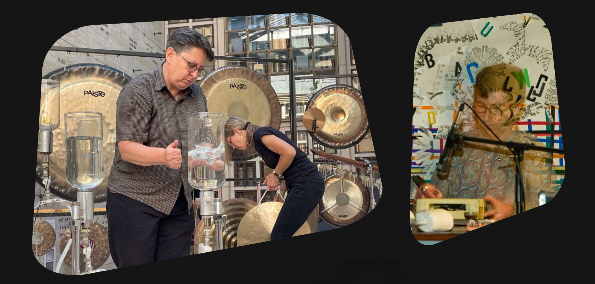 KRYS BOBROWSKI and KAREN STACKPOLE, long-time collaborators in the improvising quartet Vorticella, organically formed a duo combining Stackpole’s Gongs with Bobrowski’s Gliss Glass, an invented instrument of her own design that consists of water-filled glass vessels mounted on telescoping stands that are interconnected with tubes and valves. By varying the height of the vessels and opening and closing the valves, Bobrowski can dynamically alter the pitch of the sound by changing the level of the water as the instrument is played via friction, mallets, bare hands, and splashes. The sounds are captured via piezo pickups and amplified. The Gliss Glass blends extremely well with the sound of the Gongs played by Stackpole, who employs various techniques with friction mallets, bows, and other implements. Karen Stackpole and Krys Bobrowski create a deep sonic journey that unfurls into an engaging and transcendent soundtrack for the imagination.